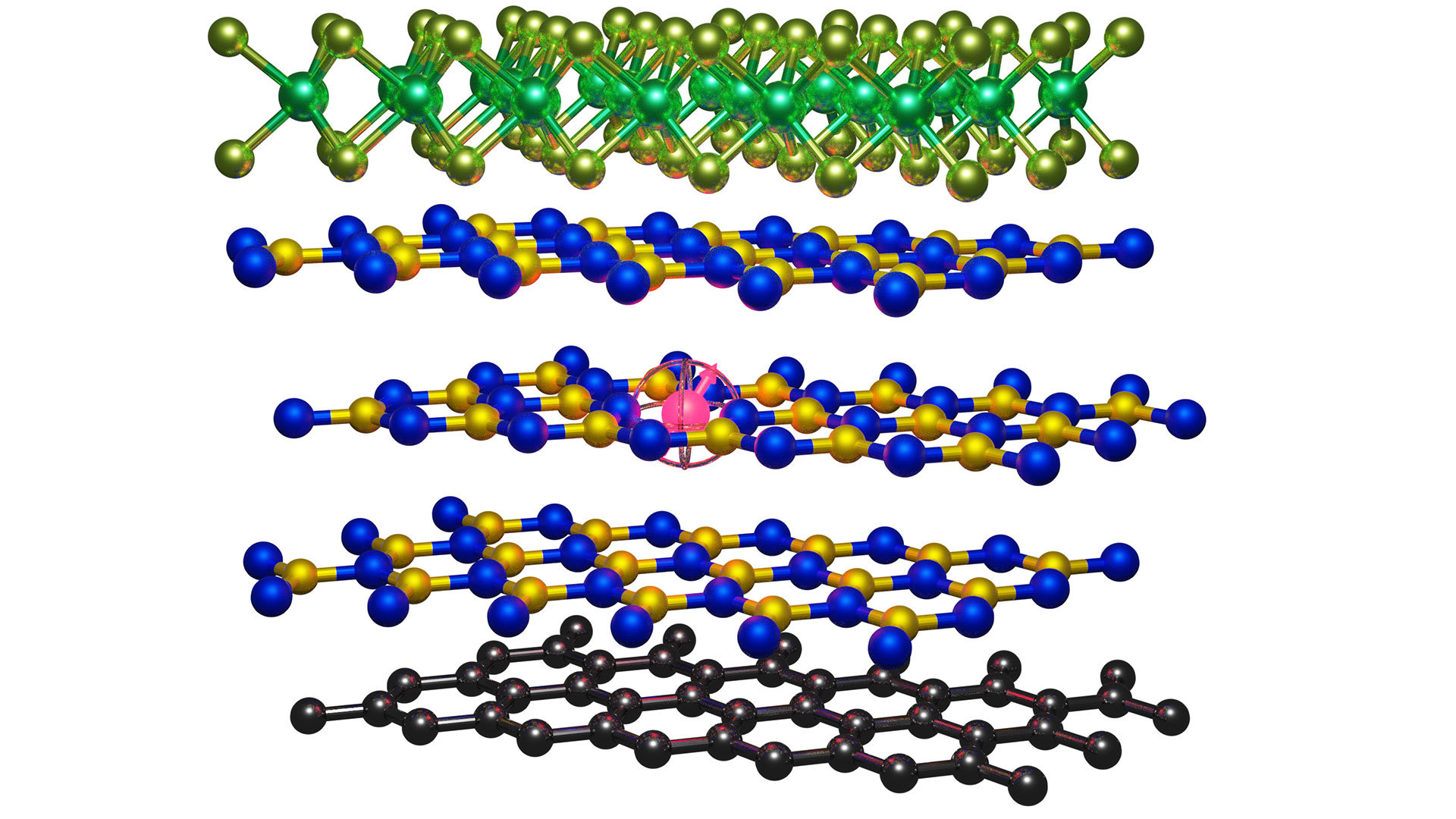 Eine solche gestapelte Struktur wollen die Forscher als nächstes realisieren. Sie besteht aus metallischem Graphen (unten), isolierendem Bornitrid (Mitte) und halbleitendem Molybdänsulfid (oben). Der rote Punkt symbolisiert den einzelnen Spin-Zustand in einer der drei Bornitrid-Schichten. (Bild: Andreas Gottscholl / Universität Würzburg)