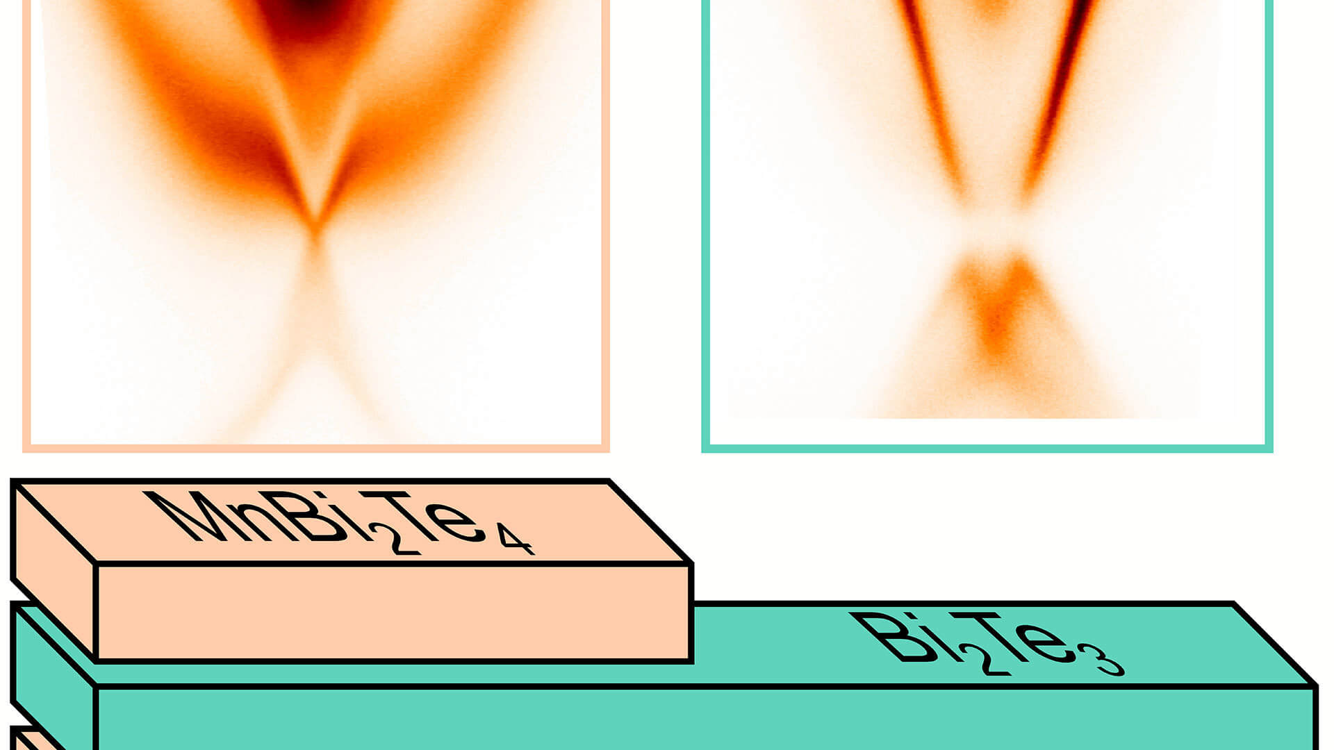 The left picture shows the measurement results for manganese bismuth telluride with a magnetic atomic layer ("MnBi2Te4") at the surface. On the right one can see the measurement results for a different atomic structure (non-magnetic "Bi2Te3" as the top layer). The results illustrate to what extent the electrons behave topologically on the material surface and whether dissipationless current conduction is possible.